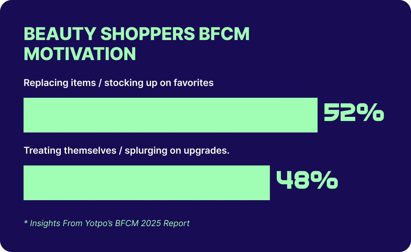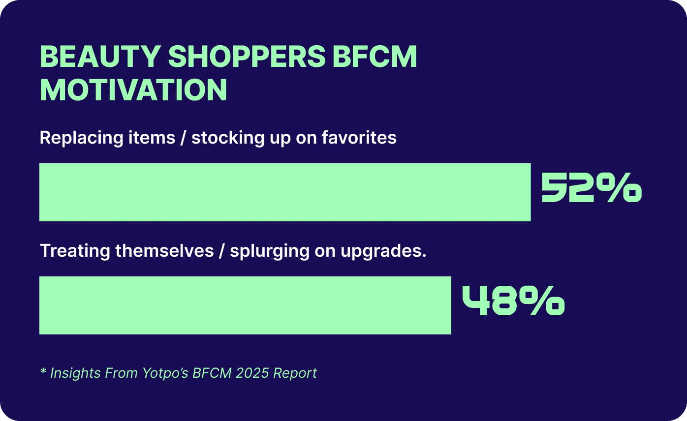 Half (50%) of shoppers like Orion delay regular beauty purchases to wait for BFCM deals, that’s lower than other industries. If he needs to restock now, he will. But when BFCM hits, it’s go-time. 52% are replacing items and stocking up on favorites (the highest rate across industries), while 48% are treating themselves, trying something new and splurging on upgrades. For restocks, he already knows what works, but for anything new, reviews are the green light. He’s confirming that the “luxury” formula isn’t just fancy packaging. Loyalty perks drive where he shops, he’s stacking rewards on bulk purchases and accessing member-exclusive bundles.