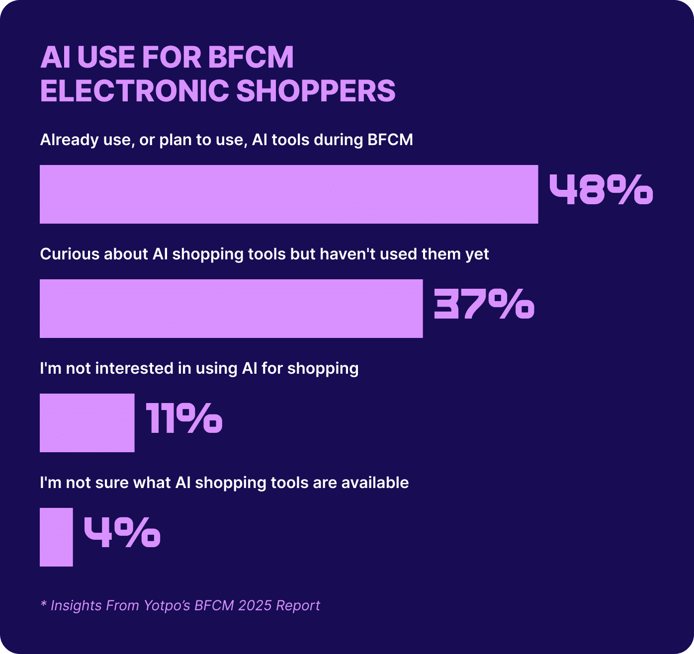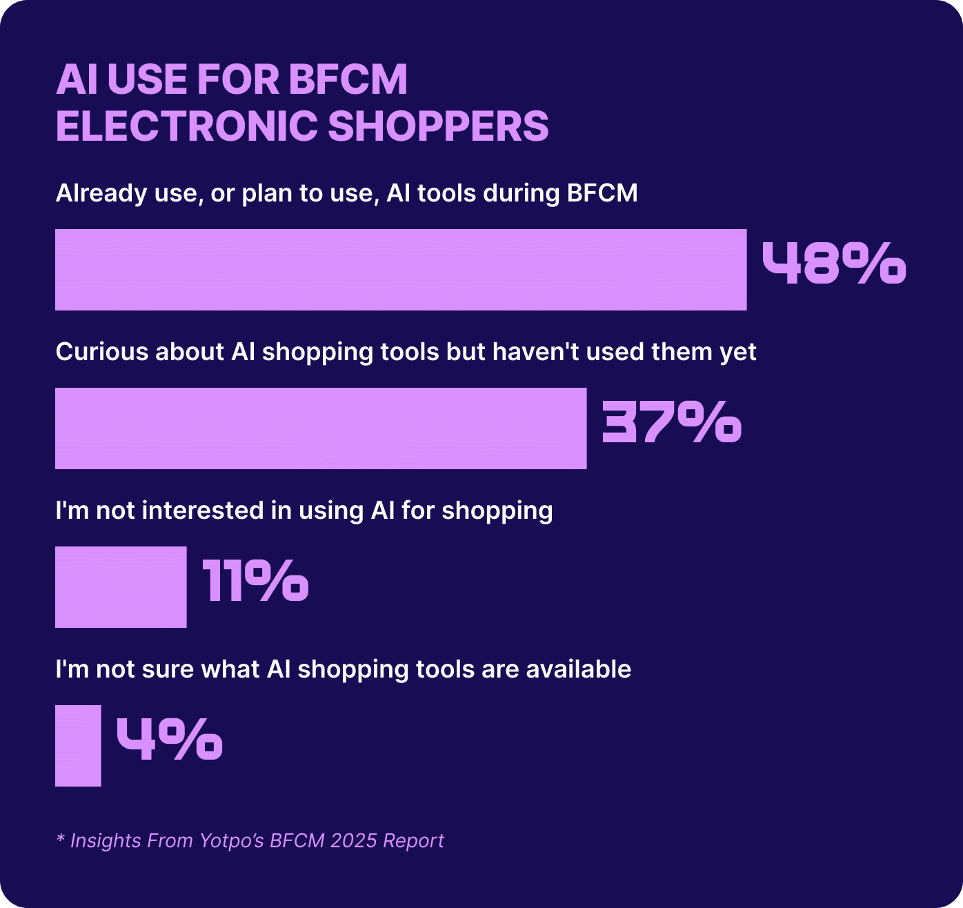 For 40% of shoppers like Lyra, research starts weeks or even months out, tracking price histories and benchmarking models like a tech analyst. About 48% already use, or plan to use, AI tools during BFCM to decode spec sheets, monitor price drops, and surface top-rated gear. For her, AI is the shortcut through the noise, turning megabytes and gigahertz into “this is the one” moments that wow recipients and justify the spend. Timing is non-negotiable. Lyra waits for maximum savings. 75% of shoppers like her play the same game, refusing to pull the trigger until the price is right and the value undeniable. With big-ticket purchases on the line, expectations run high: 66% need to see at least moderate discounts (30%+ off) to justify hitting buy. This is what BFCM is all about for Lyra when it comes to electronics. Those markdowns are what she’s been waiting for, the signal that it’s finally time to buy. Reviews are her beta testers, confirming that “revolutionary” feature actually works. Loyalty perks dictate her vendor lineup. Extra points on bundles? Extended warranties for members? She’s locked in. She defaults to brands with proven track records but will take a chance on newcomers if the ratings are bulletproof and the specs check every box on her gift list. |