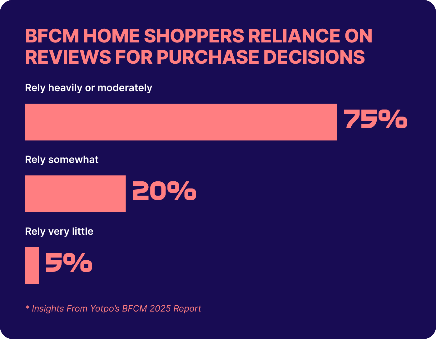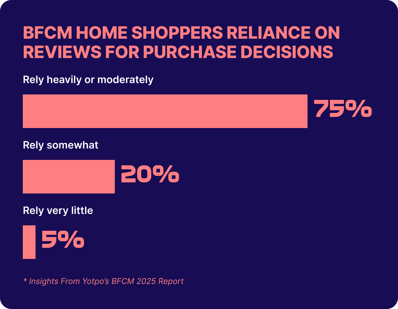 Quality standards are strict: 48% need 4.5+ star ratings, and 10% won’t buy without near-perfect 4.7+ ratings. Reviews are critical too, shoppers like Kai rely heavily on them to make purchase decisions during BFCM more than any other industry. Home purchases are investments, not experiments, so he wants to know if he will actually be able to assemble it himself and whether that “stain resistant” claim holds up.