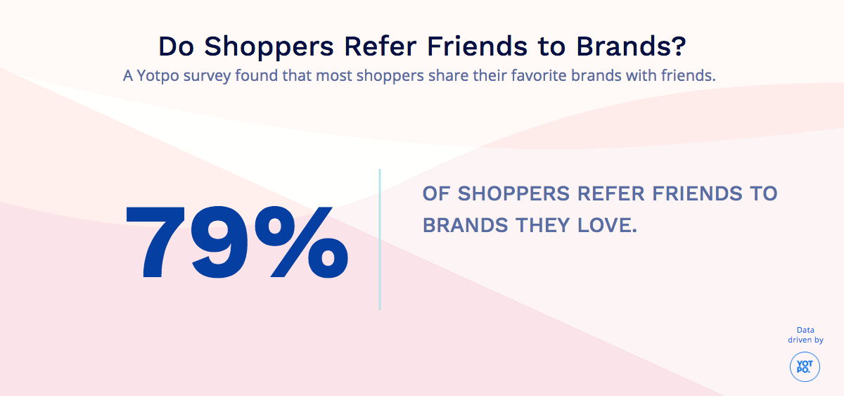 Word-of-mouth marketing is one of the most powerful forces for growing a brand. A Yotpo survey found that 79% of shoppers refer friends to brands they love. Like with most things, people are also more likely to feel comfortable buying from a recommended brand.