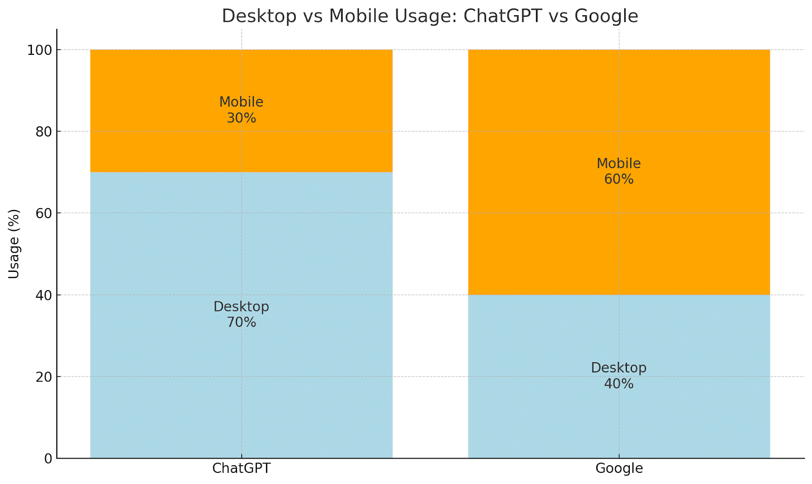 ChatGPT: Users treat it like an expert sidekick. Prompts are longer, about 23 words on average, stuffed with context, constraints, and style cues, like: “What’s a sleek waterproof commuter backpack under $200 that fits a 15-inch laptop and has good back support?” They go deep, refining with follow-up questions in the same thread. It’s a multi-turn research session, not a quick hit, and it’s mostly happening at a desk: 70% of ChatGPT visits come from desktop, so people sit down and research properly.