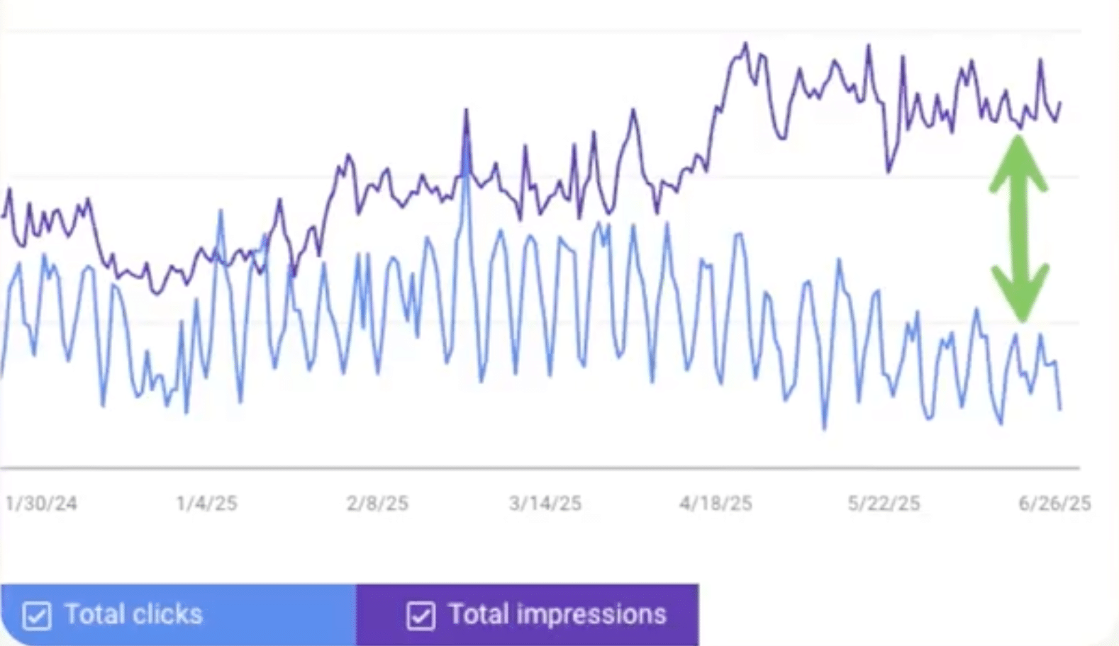 Reality Check – Real Brands, Real Data: Yotpo’s own SEO team is already seeing this shift play out: since Google rolled out AI Overviews, our visibility and rankings are up, but clicks are down. Impressions hit their highest point since January 2024, yet CTR keeps dipping because the AI box answers so many questions before visitors reach the site.