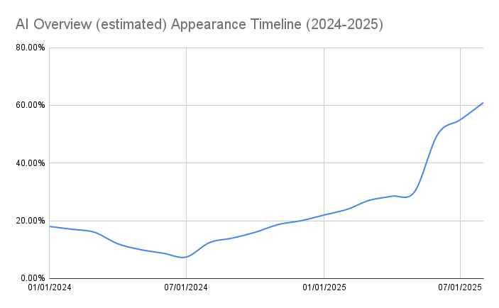 This chart tells the whole story: After a rocky launch in May 2024 that saw Google pull back AI Overviews from 18% to just 7% of searches, they’ve been steadily turning up the dial. By mid-2025, AI Overviews crossed the 50% threshold, meaning Google now answers the majority of searches directly, without sending users anywhere.